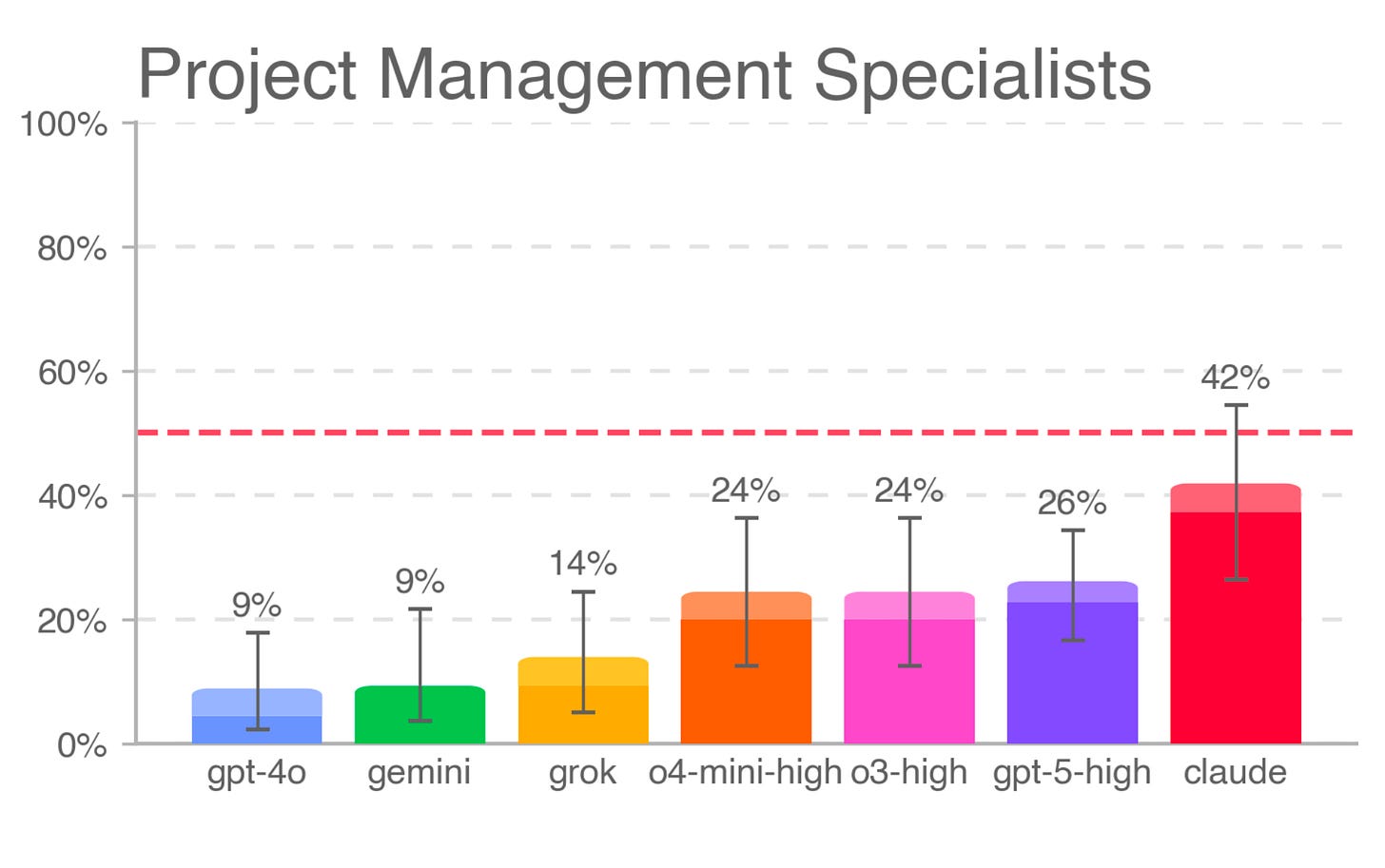 The best model, Claude Opus 4.1, won 42% of the time across all project management tasks. While that could be read as evidence of human superiority, there are some important caveats to consider: