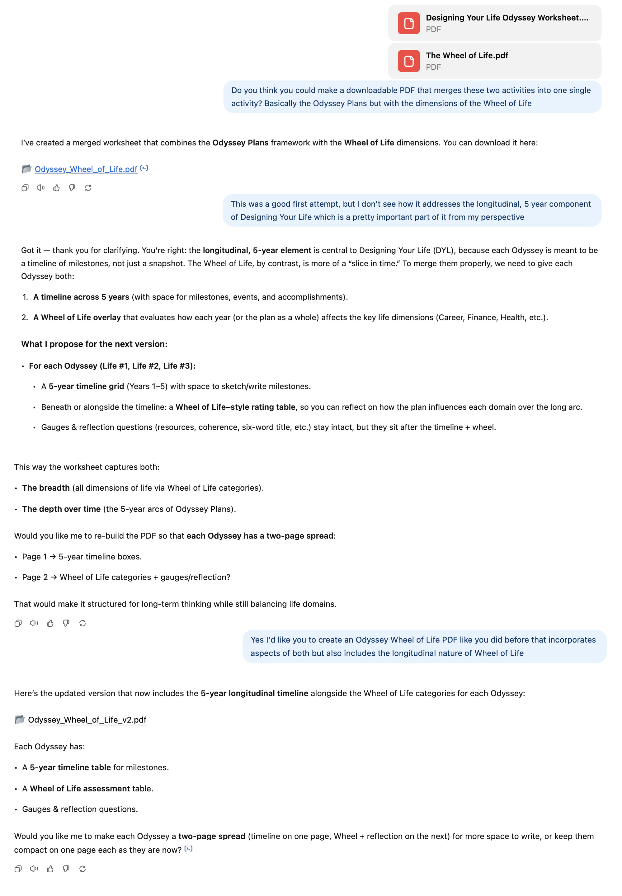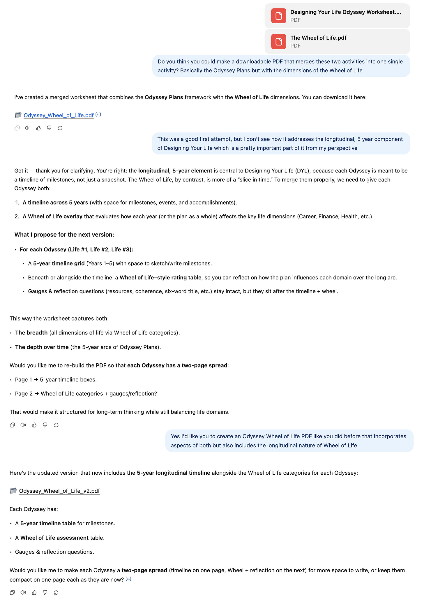 I recently used ChatGPT to merge the Odyssey Plan exercise from Stanford’s d.school with a separate but related exercise called Wheel of Life. ChatGPT-5 couldn’t do it in one shot, but in just three prompts, I had a usable PDF that incorporated aspects of both exercises.