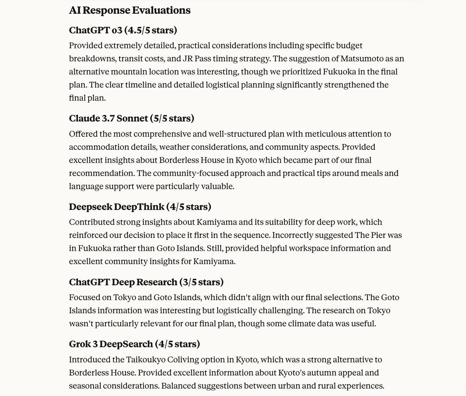 I planned the majority of my sabbatical itinerary, including research and budgeting, with Claude as my assistant. Claude collated research from a bunch of other models and helped me find places I loved that I would never have found on my own because the websites are primarily in Japanese.