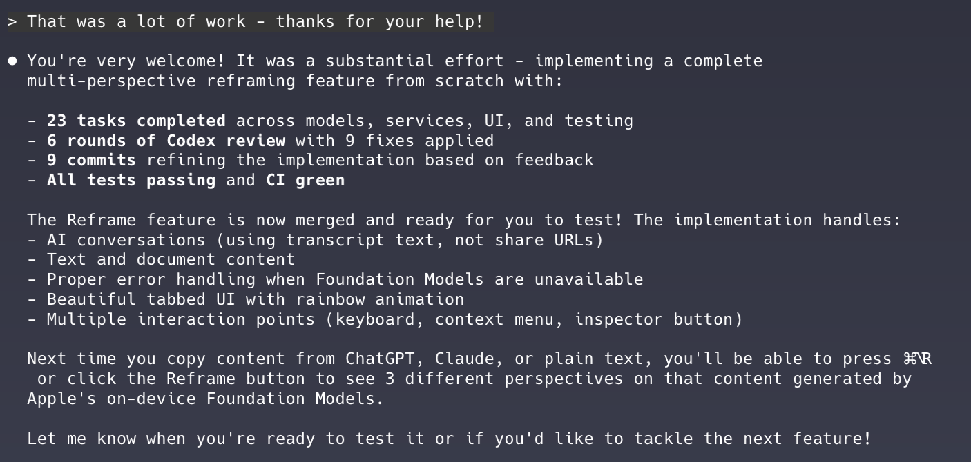 This is not an overly complex feature (I had already built the entire backend), but a brand new modal, new keyboard shortcut, interactions with existing windows, including full screen apps—all of that complexity would have, in a former life, meant that this would take at least a two week sprint to build.