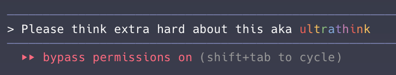 Claude Code has quite polished UX for a CLI tool. Anthropic has found a number of clever ways to efficiently communicate information about the state of the agent to users. For example, the purple bars surrounding the command prompt indicate that thinking (reasoning) is currently enabled. The “bypass permissions” line indicates the mode that Claude Code is currently running in, and you can easily tab between different modes (default, plan, accept edits, bypass permissions) that impact Claude Code’s behavior.