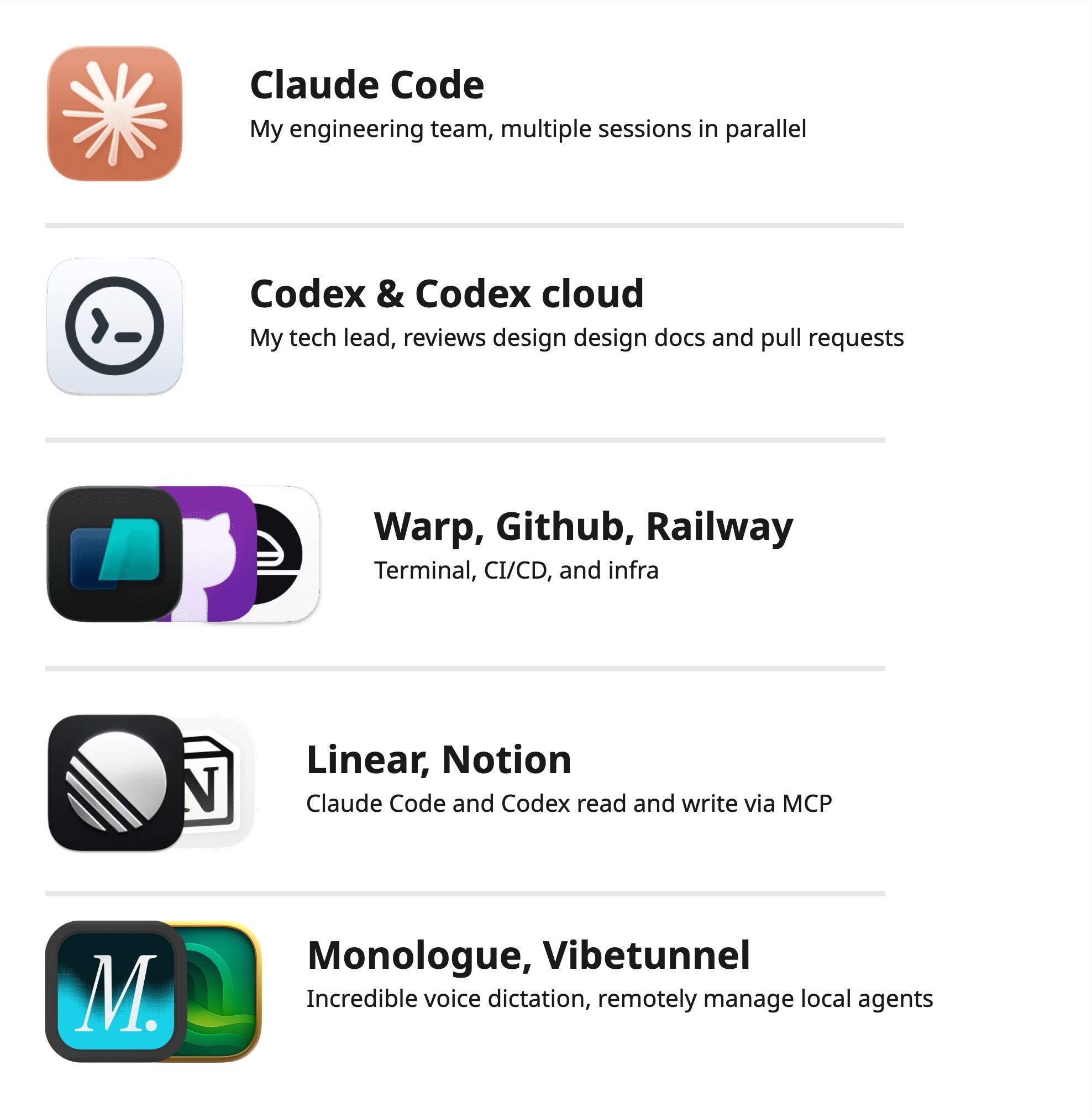 Claude Code and Codex are both connected to Linear and Notion via MCP, which lets them read and write directly to these applications. It is very convenient to be able to ask Codex to review the backlog, help decide on which ticket to address next, flesh out that ticket, and then pass it over to Claude Code.