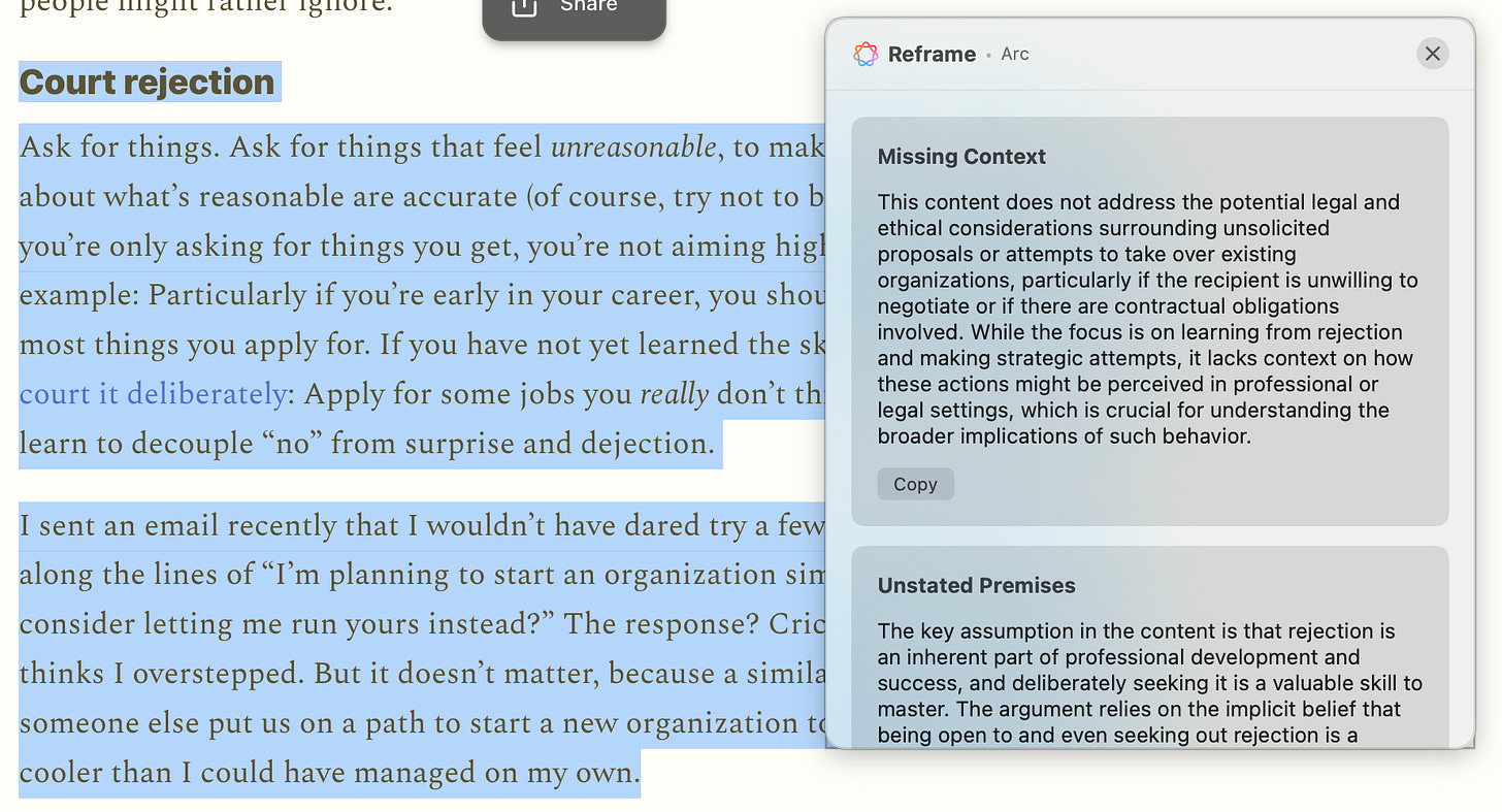 A day later (and it only took that long because I had to sleep), I built just that—Kaleidoscope now lets you select any text on your computer (including native apps and on the web), press Command+Shift+R, and get three reframes right on top of the content itself.