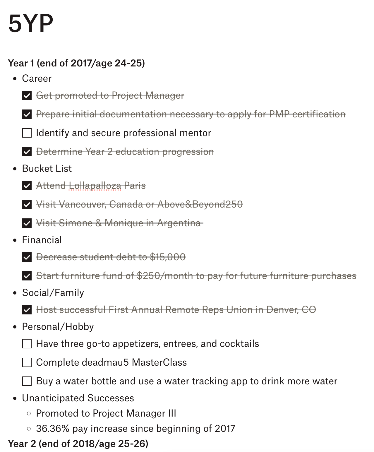 Not only that, I always felt worse about the goals I didn’t achieve vs. the ones I did. Looking back at my old plans, many of the “unanticipated successes” I didn’t plan for (some of which were quite meaningful, like eliminating my student debt years earlier than expected) somehow still feel small in comparison to the unchecked boxes of very important goals I set but didn’t achieve, like reading a behavioral economics book every quarter.