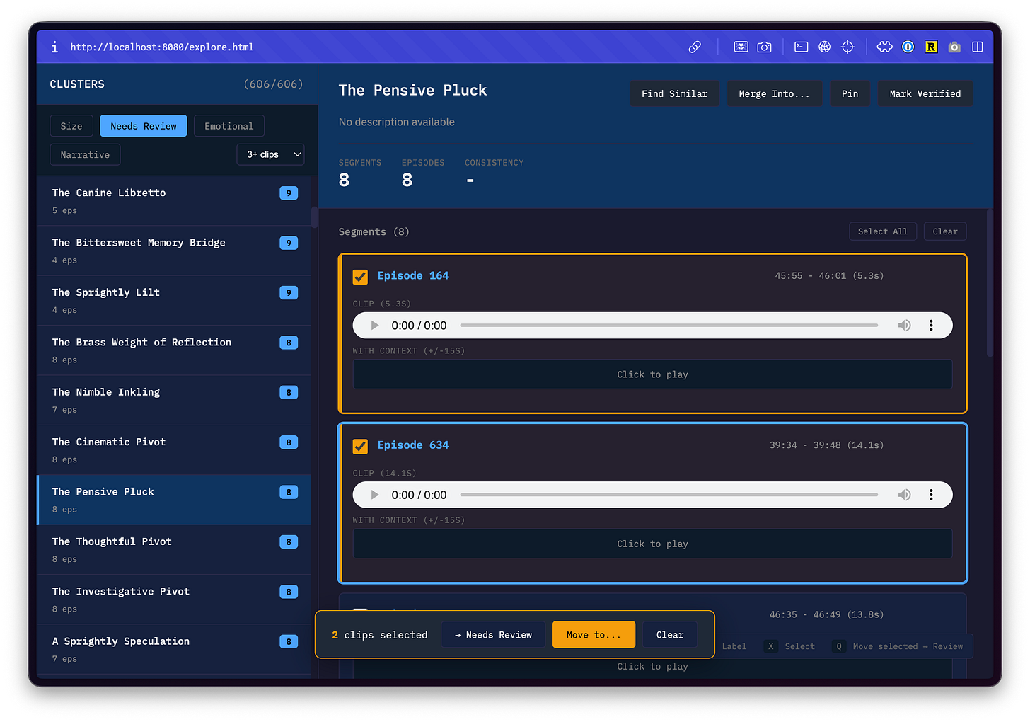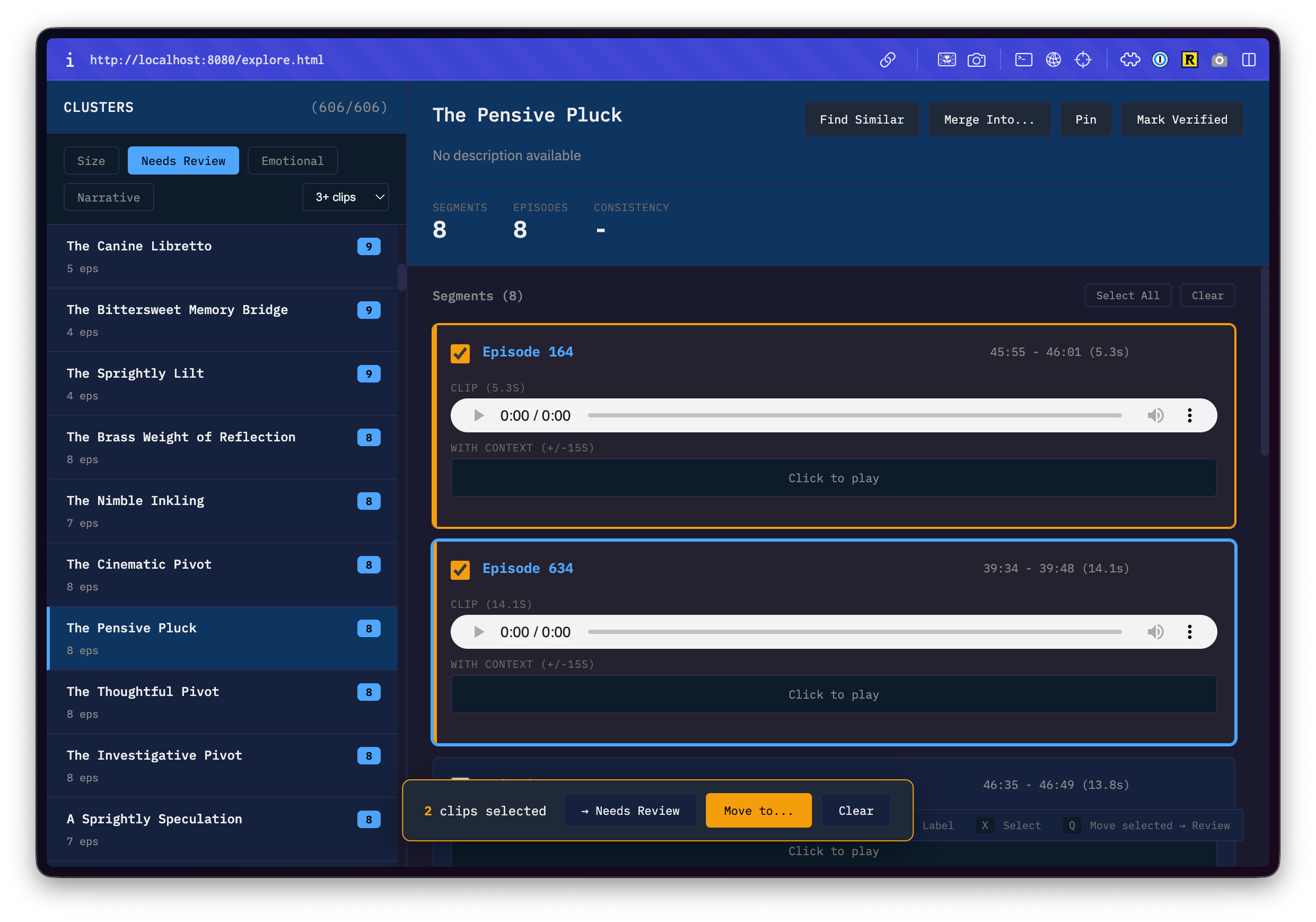 The curation tool was a simple web app that let me play audio clips, listen to what the algorithm had grouped together, and manually break apart and merge clusters that should have been combined as well as flag segments that needed further review.