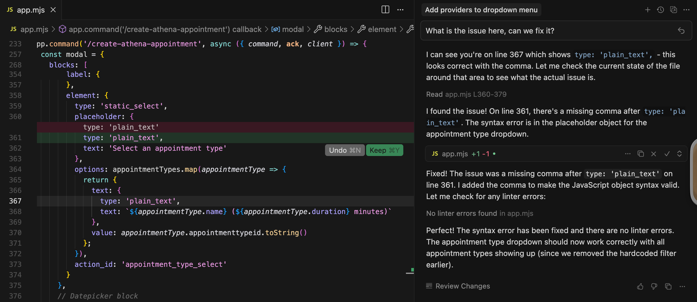 In this era (read: a year ago), every time I wanted to make a change, I had to copy the entire file as well as relevant API documentation into ChatGPT, apply some degree of prompt engineering to make sure it wouldn’t give me back code with a bunch of placeholders, manually apply its suggestions back to the file, restart the app, and then copy errors from the console back into the chat window when the app inevitably didn’t work. This was a fairly tedious (and at times extremely frustrating) process: