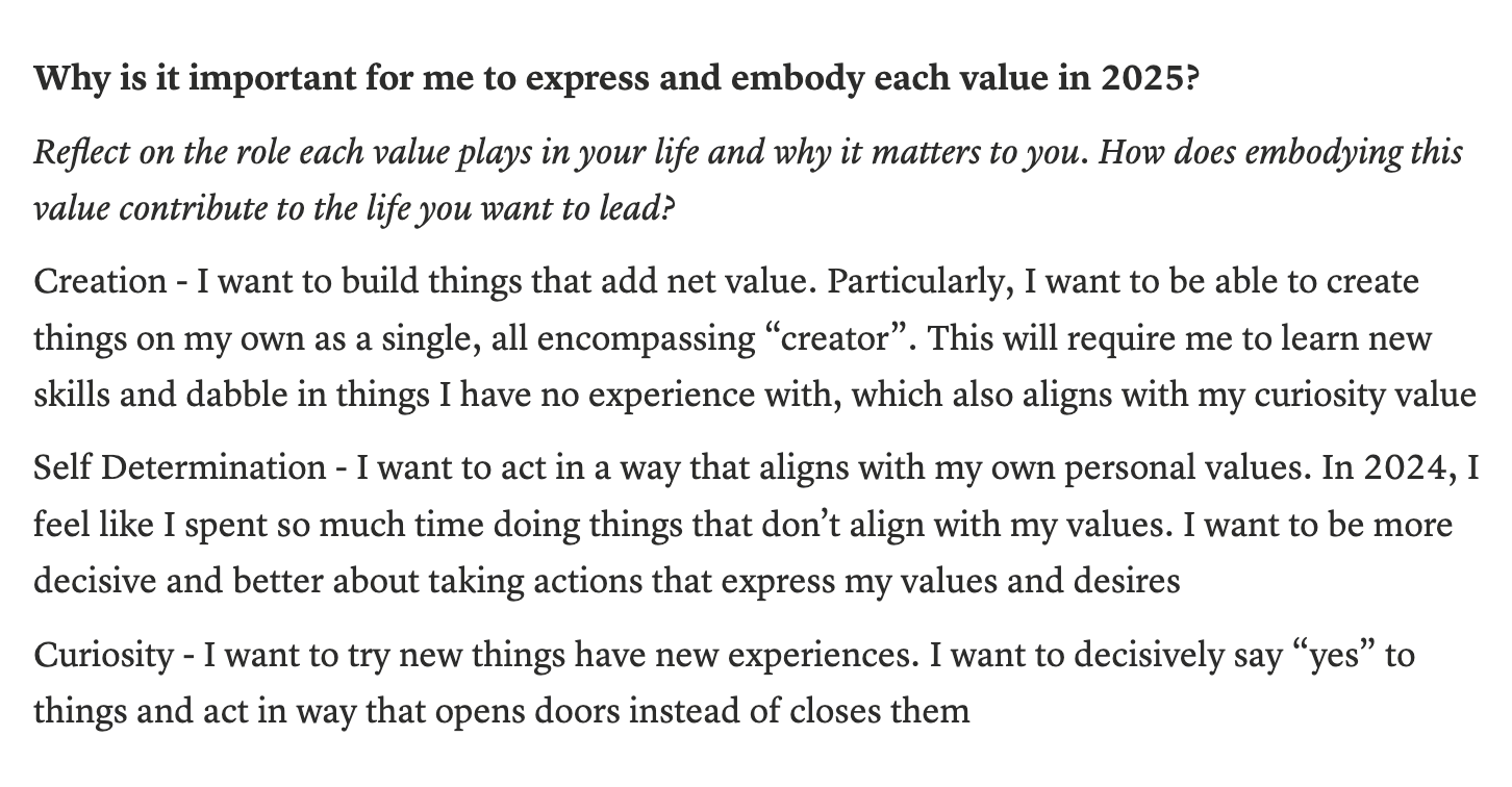 Last year’s version was oriented around values, and my top values that I wanted to focus on in 2025 were creation, self determination, and curiosity. Here’s what I wrote about each of those: